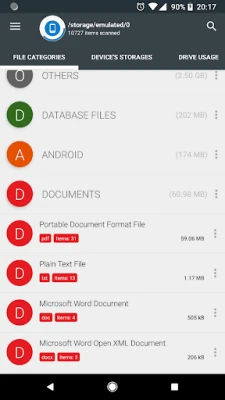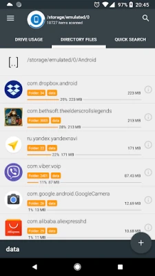 Application reads from the device storage list of files and file-specific data (name, path, size, last modified date, file preview) in order to build device statistics and display it in a form of report and file usage diagram (pie chart, sunburst chart).
